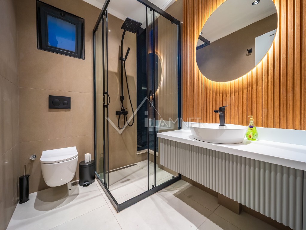 Mutfak : Modern Amerikan mutfak içerisinde yemek masası ve sandalyeler, buzdolabı, çamaşır makinası, bulaşık makinası, ankastre fırın, mikrodalga fırın, 4'lü ocak, tost makinası, çay makinası, elektrikli su ısıtıcısı, yemek takımı, çatal bıçak seti, tencere ve tava takımı, bardaklar bulunmaktadır.