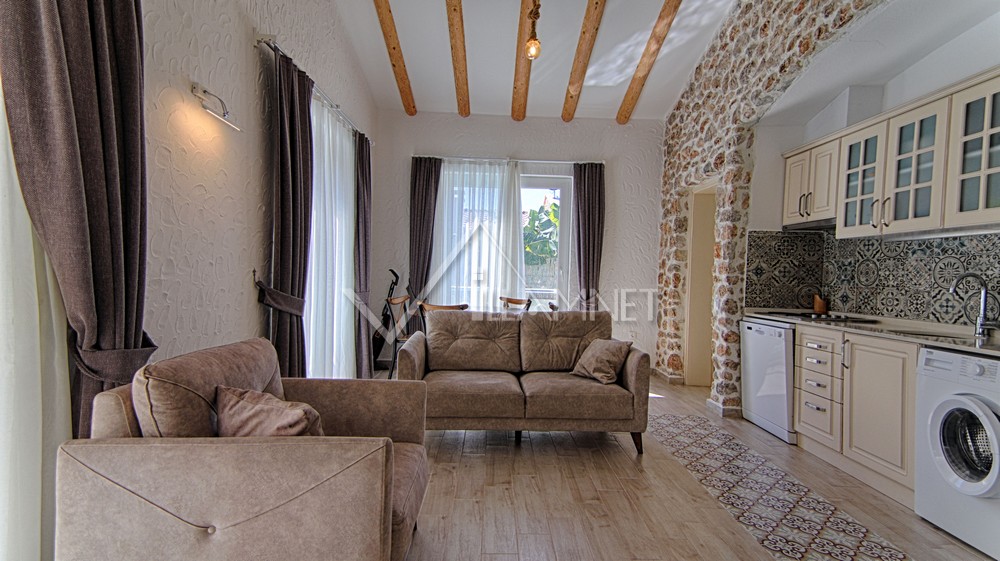 Salon : Özenle dizayn edilmiş açık mutfaklı salonda şık ve rahat bir oturma grubu, yemek masası ve sandalyeler, televizyon, uydu alıcı, internet erişimi için wi-fi, klima bulunmaktadır. Salonumuz havuz ve bahçe manzaralıdır.
