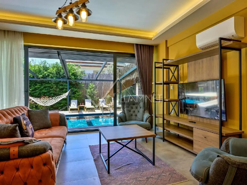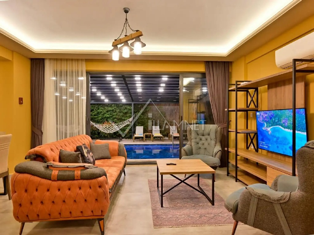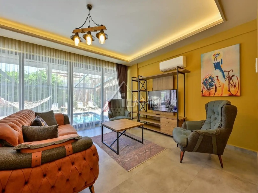 Salon : Konforlu bir oturma grubu, televizyon, uydu alıcı, klima, yemek masası ve sandalyeler bulunmaktadır.