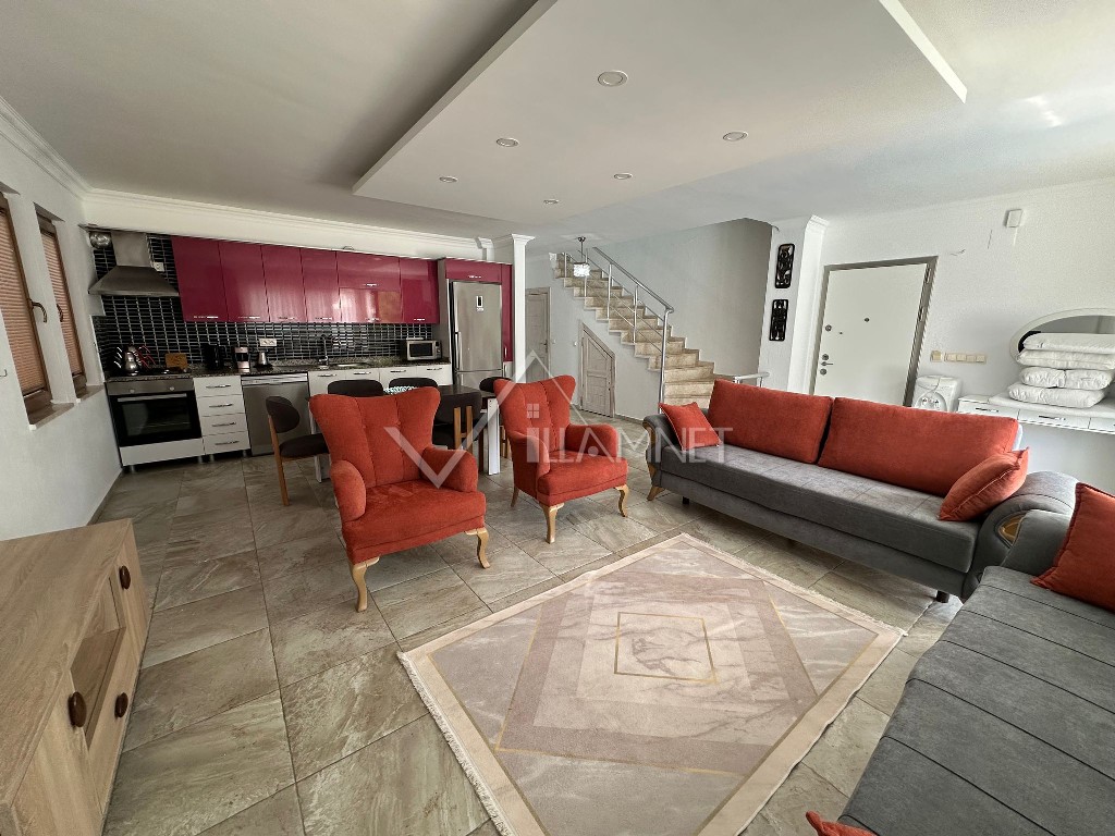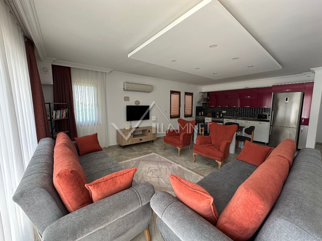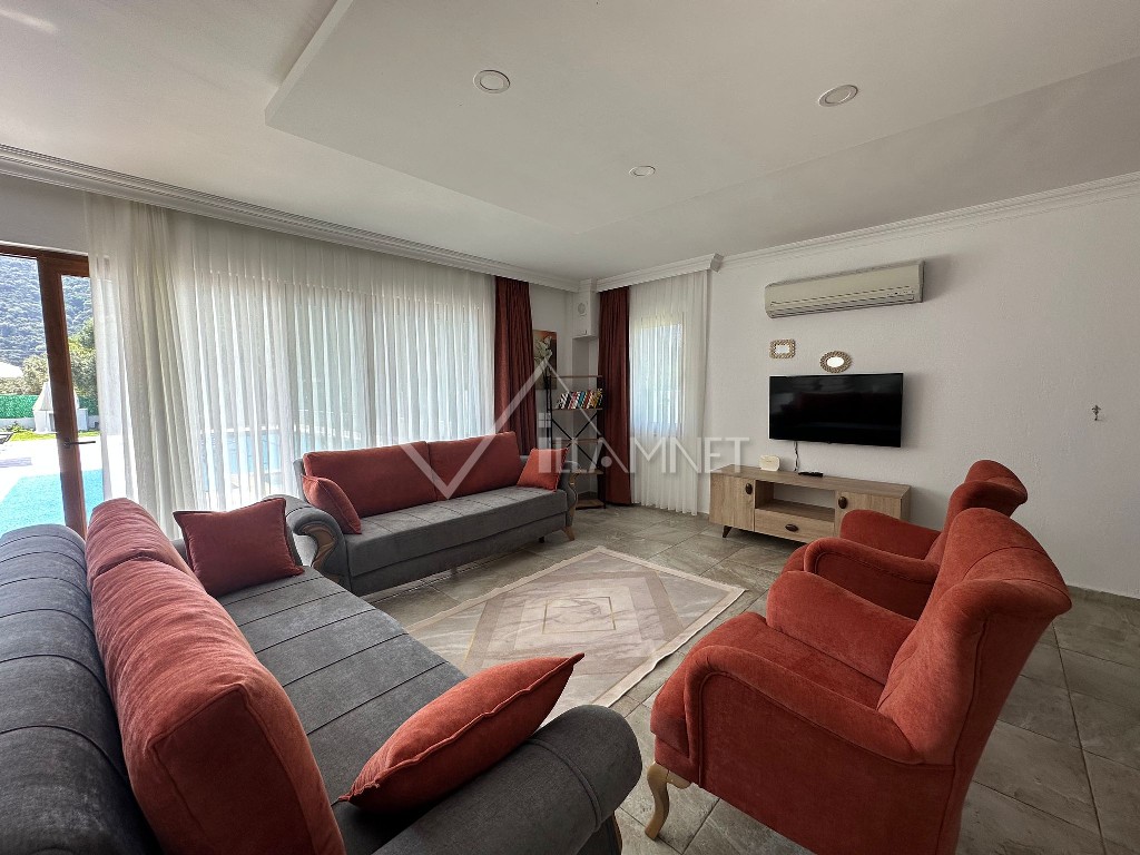 Salon : Zevkle tasarlanmış salonumuzda oturma grubu, TV, orta sehpa, klima, internet erişimi için wi-fi, havuz terasına çıkış bulunmaktadır.