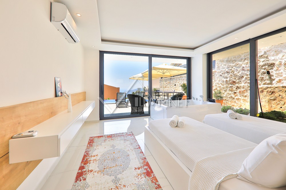 1. Yatak Odası : 1 adet çift kişilik yatak, suit oda deniz manzaralı yatak, tv , klima, komodin, elbise dolabı, jakuzi, ebeveyn banyo ve wc, bulunmaktadır.