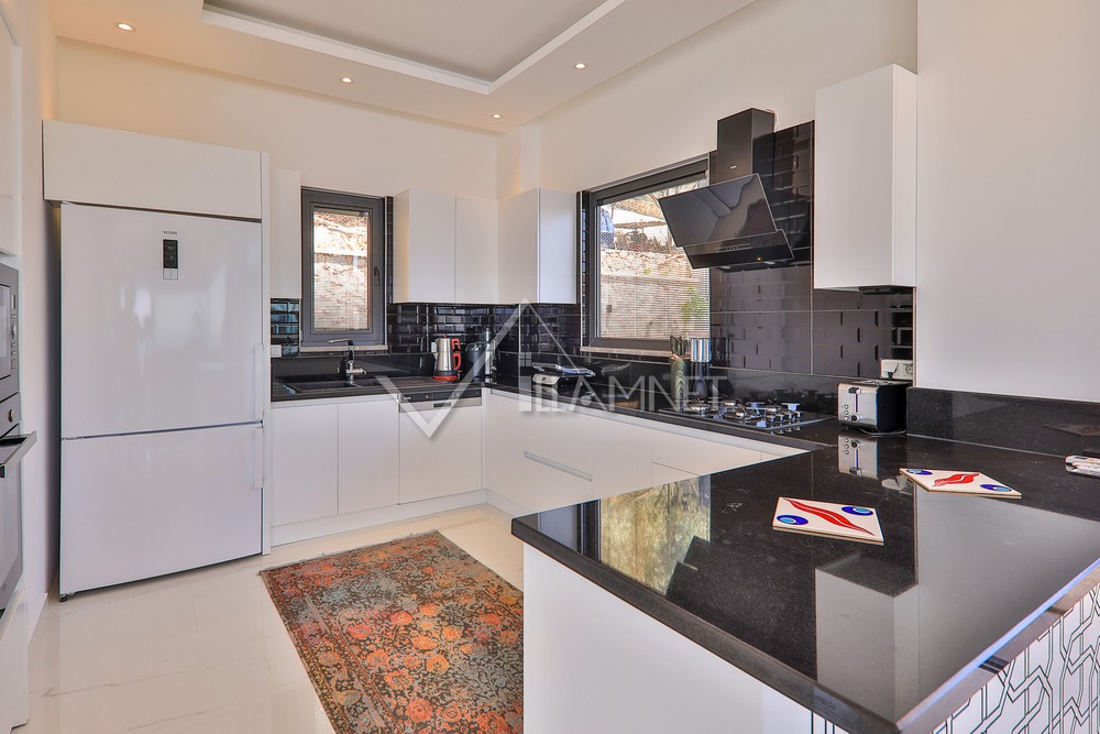 Mutfak : Modern Amerikan mutfakta, buzdolabı, bulaşık makinası, ankastre fırın, mikrodalga fırın, ankastre 4’lü ocak, elektrikli su ısıtıcısı (kettle), yemek masası ve sandalyeler, yemek takımı, tava, tencereler, çatal, bıçak vs. bulunmaktadır. Villamızda çamaşır odası ve çamaşır makinası vardır.