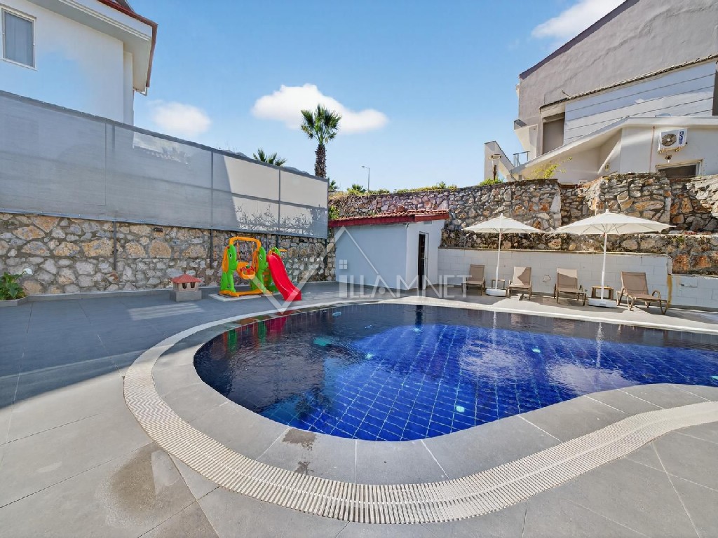 Bahçe : Yemek masası ve sandalyeler, Havuz başında şezlong ve şemsiyeler bulunmaktadır.