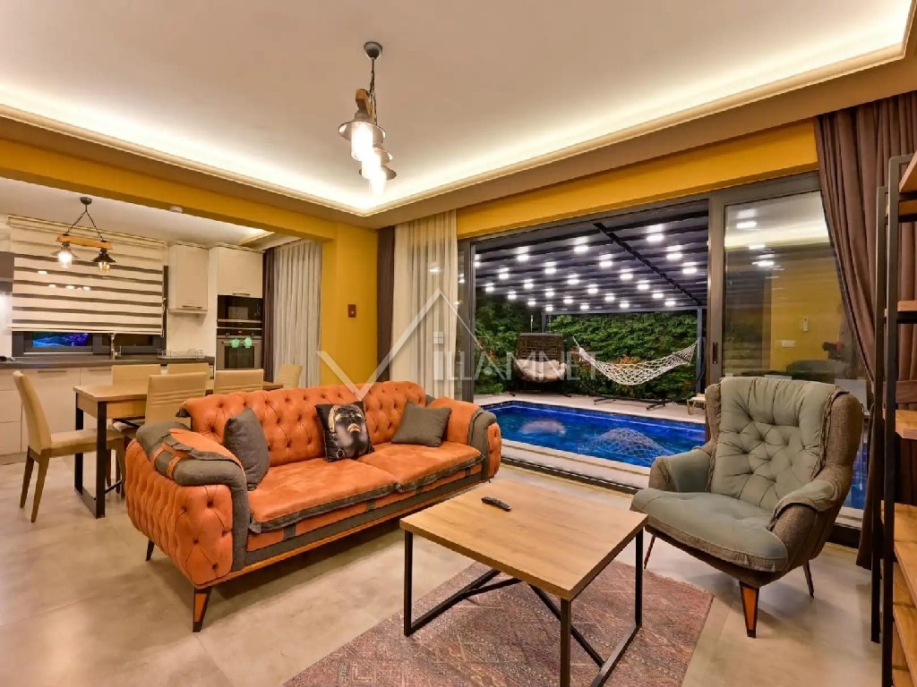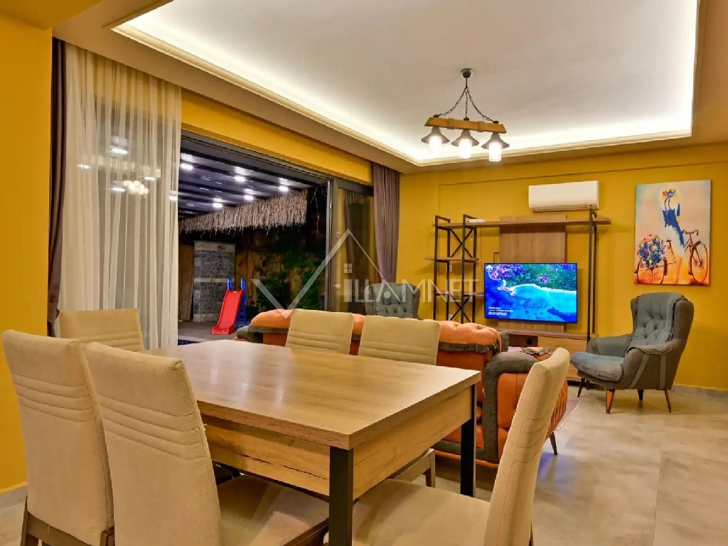 Salon : Konforlu bir oturma grubu, televizyon, uydu alıcı, klima, yemek masası ve sandalyeler bulunmaktadır.