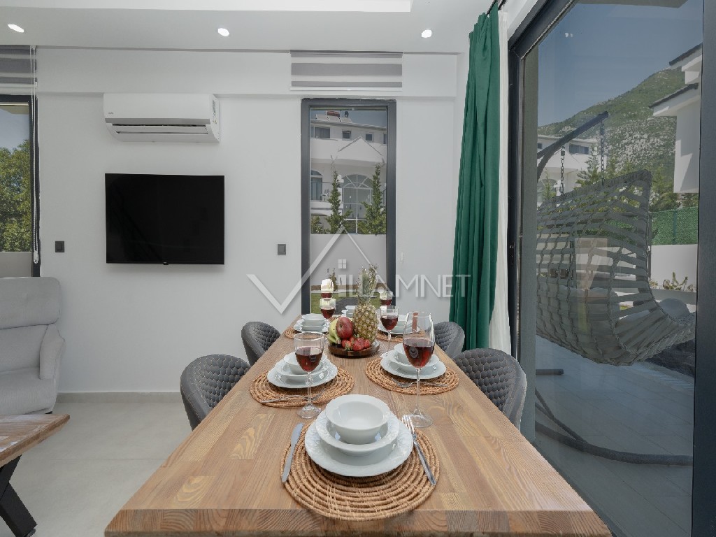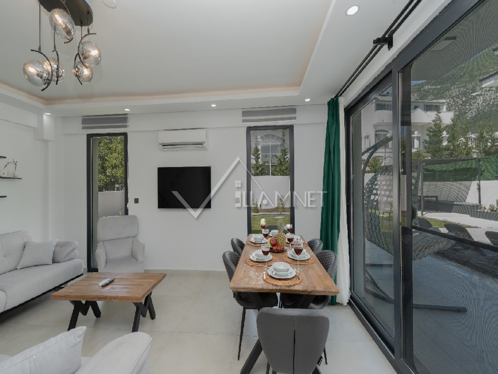 Salon : Modern tasarımlı, özenle dizayn edilmiş salonda şık ve rahat bir oturma grubu, yemek masası ve sandalyeler, televizyon, uydu alıcı, internet erişimi için wi fi, klima, bulunmaktadır. Salondan havuz kenarına direkt çıkış vardır.